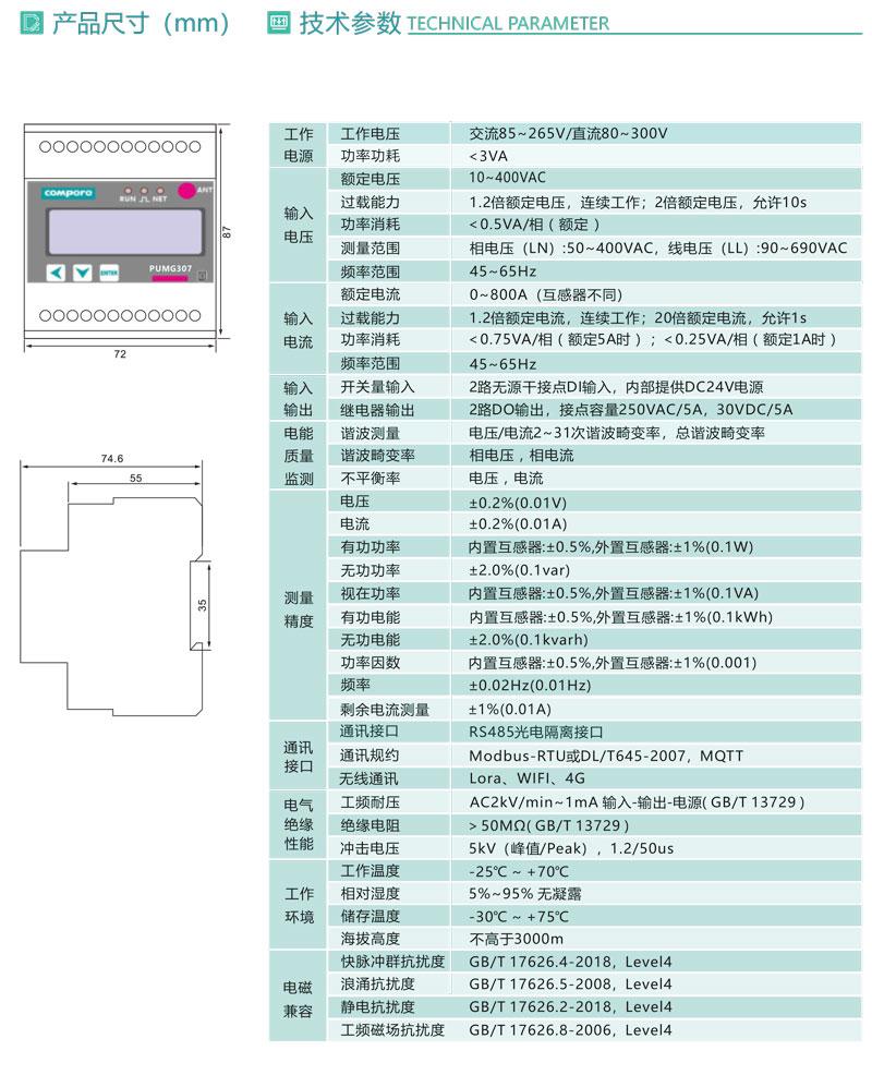 PUMG307系列三相導(dǎo)軌式智能電力能效終端采用DIN35mm 導(dǎo)軌式安裝結(jié)構(gòu)和LCD液晶屏顯示,集三相電參量測量、2~31次諧波分析、時(shí)間統(tǒng)計(jì)等于一體,標(biāo)配1路RS485通訊接口,可通過Modbus-RTU或DL/T645-2007通訊協(xié)議實(shí)現(xiàn)儀表的網(wǎng)絡(luò)化管理。還可擴(kuò)展2路開關(guān)量輸入 和2路 繼 電 器 輸 出 , 可 外 接 開 口 式 互 感 器 易 于 改 造 項(xiàng) 目 的 施 工 。PUMG307具有體積小巧,精度高,可靠性好,安裝方便等優(yōu)點(diǎn),多用于系統(tǒng)集成、改造工程、安裝空間有限或不便的項(xiàng)目。