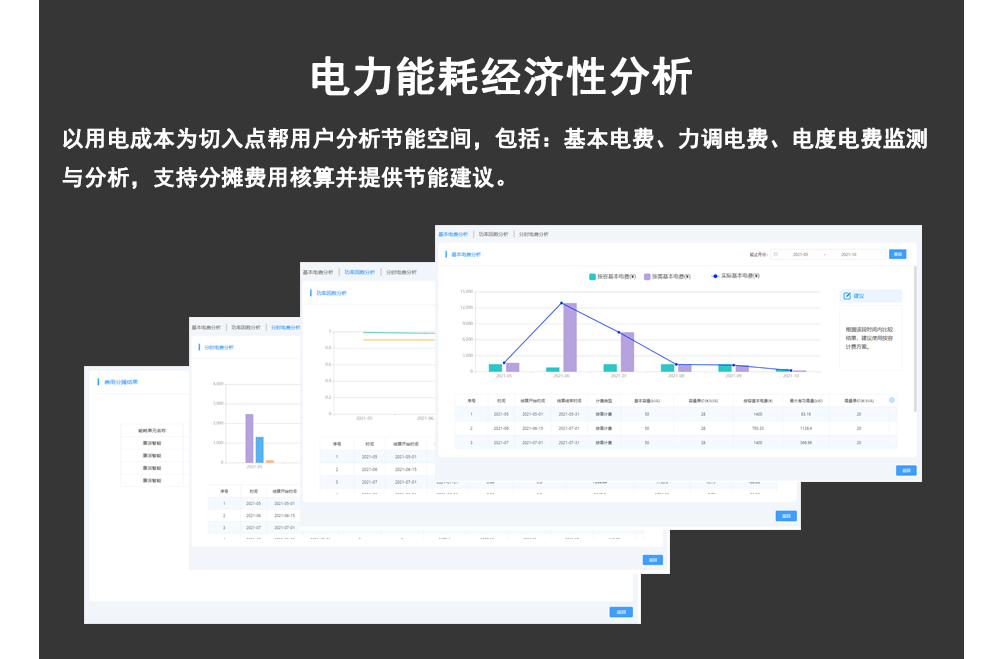 電費優(yōu)化管理系統(tǒng),能夠解決采用兩部制電價的大工業(yè)用電企業(yè)容需電費分析(基本電費)、分時電費分析(電度電費)、力調(diào)電費分析等電費優(yōu)化問題,提供度電成本核算、降費潛力分析、優(yōu)化建議、變損分析、負(fù)荷特性分析等多維度分析方案,并自動生成月度電費優(yōu)化報告,讓大工業(yè)用戶的電費管理更加科學(xué)合理!