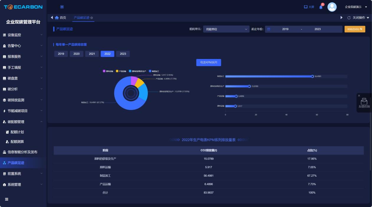展示企業(yè)各個產(chǎn)品不同時間段的碳排放量以及每個產(chǎn)品各個階段的碳排放量。通過數(shù)字化、可視化的方式展示企業(yè)產(chǎn)品碳足跡,從而協(xié)助企業(yè)進(jìn)行產(chǎn)品碳足跡認(rèn)證工作。