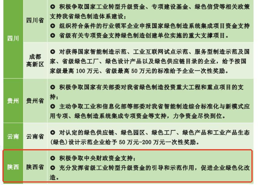 為貫徹落實《“十四五”工業(yè)綠色發(fā)展規(guī)劃》《工業(yè)領(lǐng)域碳達峰實施方案》,各省份積極響應(yīng)并分別發(fā)布了依據(jù)本地區(qū)特點制定的相關(guān)政策,為激勵工業(yè)企業(yè)積極進行綠色工廠、綠色設(shè)計產(chǎn)品、綠色園區(qū)創(chuàng)建和申報,大部分地區(qū)政府對于入選國家級綠色園區(qū)、工廠名單的企業(yè)給予一次性獎勵100萬元,部分城市的獎勵金額更是達到了1000萬元。關(guān)于綠色工廠,不同的省市都有不同的鼓勵性政策補貼,下圖是山西省份的政策補貼: