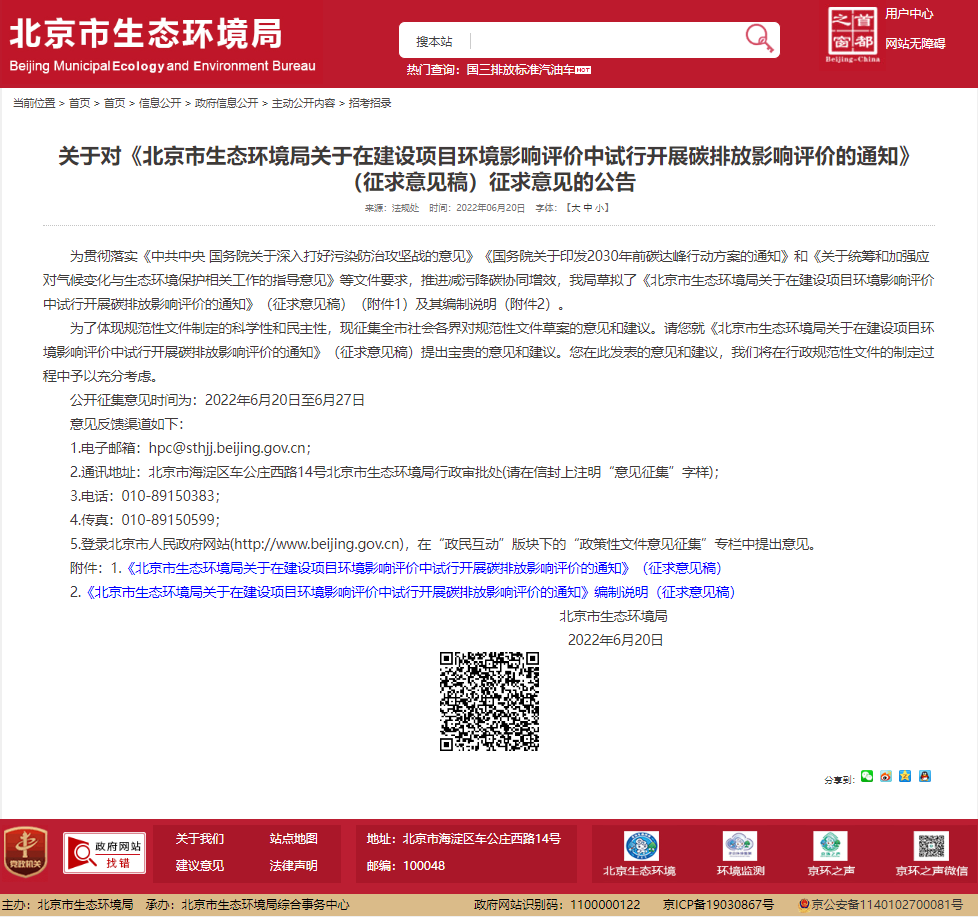 北京市生態(tài)環(huán)境局官網(wǎng)6月20日發(fā)布公告,就《北京市生態(tài)環(huán)境局關于在建設項目環(huán)境影響評價中試行開展碳排放影響評價的通知》(征求意見稿)公開征求社會各界意見?! ?br />