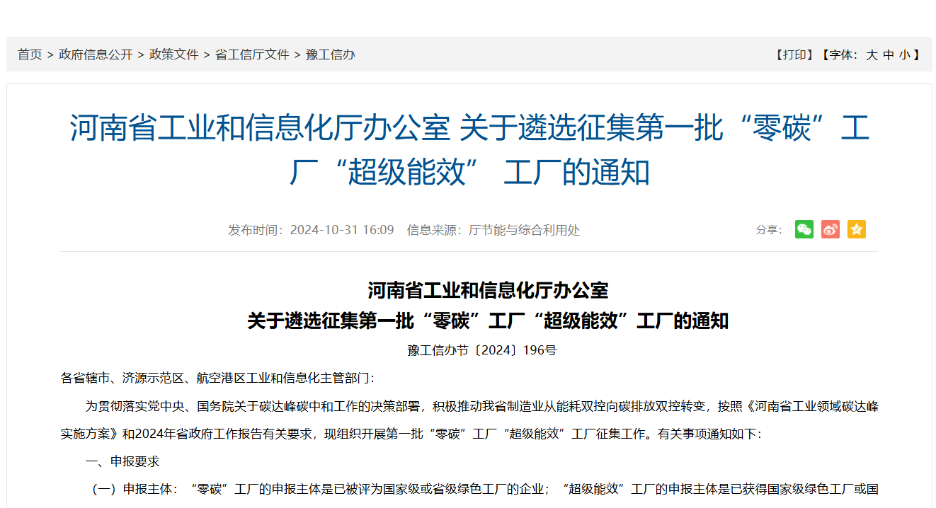 關于征集推薦河南省第一批“零碳”工廠 “超級能效”工廠的通知