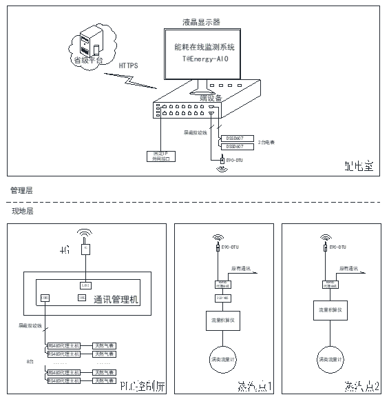 方式二:增加一套蒸汽流量計,該流量計具備通訊功能,單獨用于能耗在線監(jiān)測系統(tǒng)。配套設(shè)備有無線Lora,將表計的RS485口接入無線Lora模塊, Lora模塊將數(shù)據(jù)傳輸至端設(shè)備。